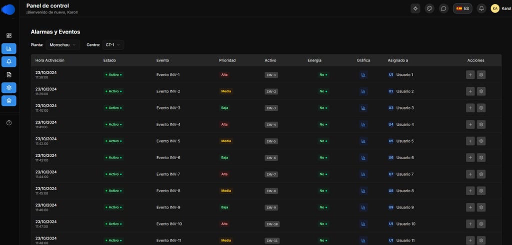 Monitorea y registra automáticamente las alarmas y eventos operativos, facilitando el seguimiento y análisis de situaciones críticas.