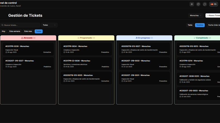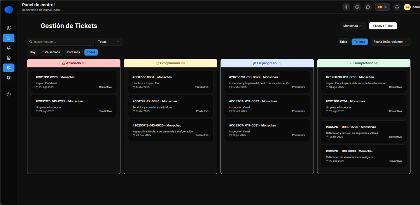 Facilita el registro y seguimiento de incidencias o solicitudes de servicio, asegurando un flujo de trabajo organizado y eficiente.