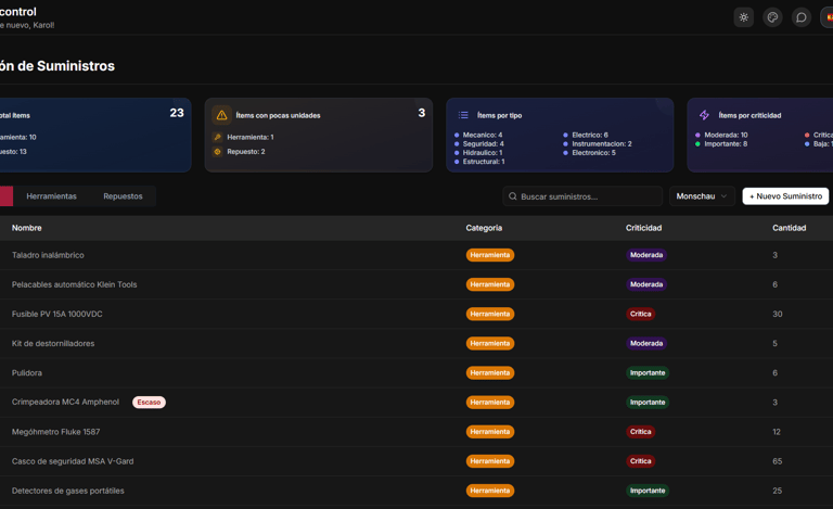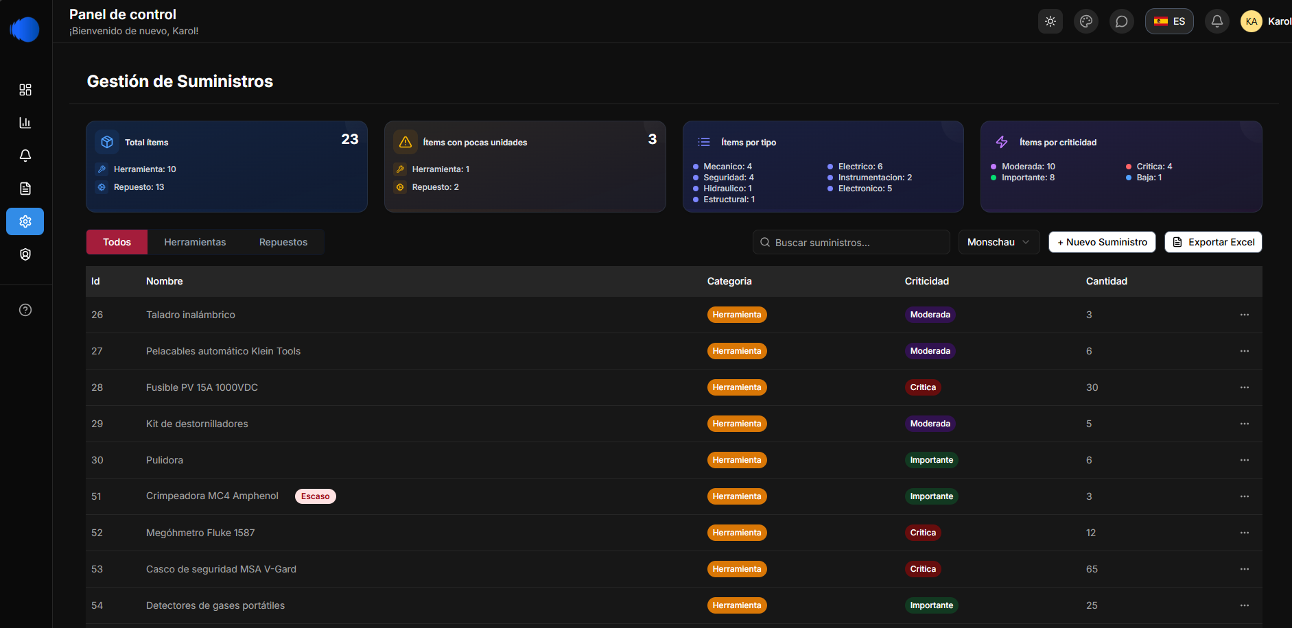 Incluye funcionalidades para monitorear y controlar el inventario de repuestos, asegurando la disponibilidad de los materiales necesarios para el mantenimiento.